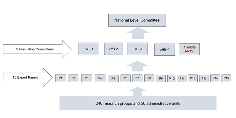 For hvert nivå i evalueringen utformer de internasjonale fagfellene rapporter med støtte av et profesjonelt sekretariat. Rapportene inneholder vurderinger basert på bestemte kriterier og evalueringsdata, og råd om tiltak som kan bidra til økt kvalitet, relevans av forskningen og strategisk utvikling av enhetene.